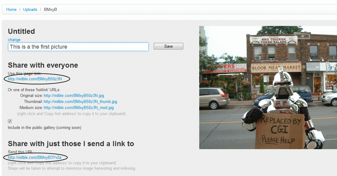 How to create an album - upload and (optionally) title your picture, make a note of the public (or private) page URL generated